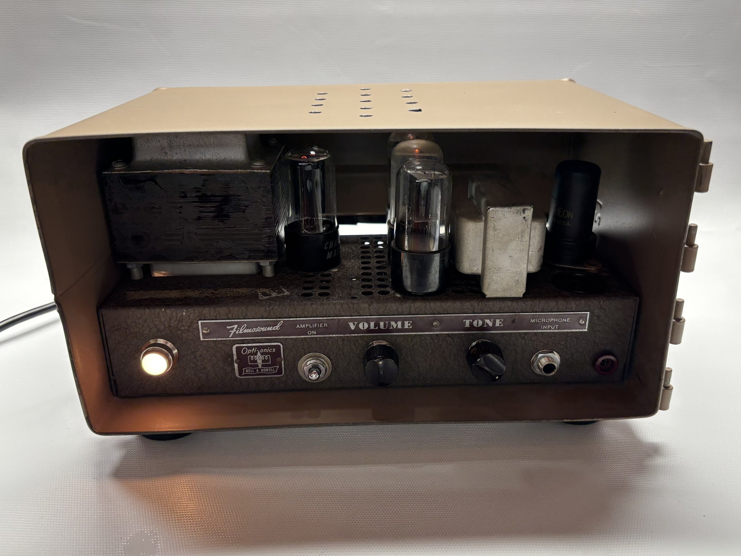 The AMPSAMPS Model 2. My homage to American Tweed amps. I do these point to point, hardwired reusing the original tubes and transformers from the Filmosounds.
